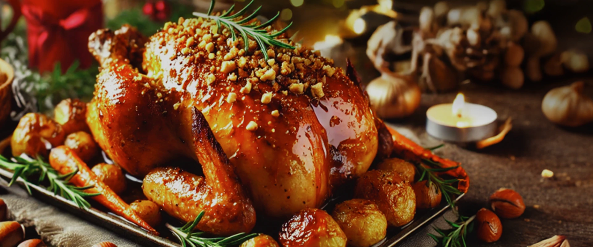 A stunning centerpiece for your holiday table! This roast chicken features a maple-hazelnut glaze for a perfect balance of sweet and nutty flavors. Toasted BC-grown hazelnuts add crunch and elegance to this festive dish.